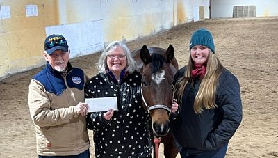 DAR member Rita Duffy (center) presents a donation check to employees of the non-profit, BraveHearts, on behalf of Signal Hill Chapter, NSDAR. BraveHearts is a 501 c3 organization whose mission is to bring hope, joy, and unlimited possibilities through the healing power of the horse. Shown with Rita are BraveHearts employees Bill Mercurio, Veteran Relations Coordinator and U.S. Army Veteran, “Tugg,” and Amanda Bethards, Volunteer Coordinator and U.S. Navy Veteran. For more information about BraveHearts, visit braveheartsriding.org.